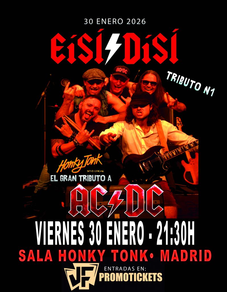 ¡Vuelve el mayor homenaje al rock más potente! Eisí Disí, el tributo Nº1 a AC/DC, llega a la legendaria Sala Honky Tonk para hacer temblar Madrid con los riffs más salvajes y la energía más pura del rock clásico.